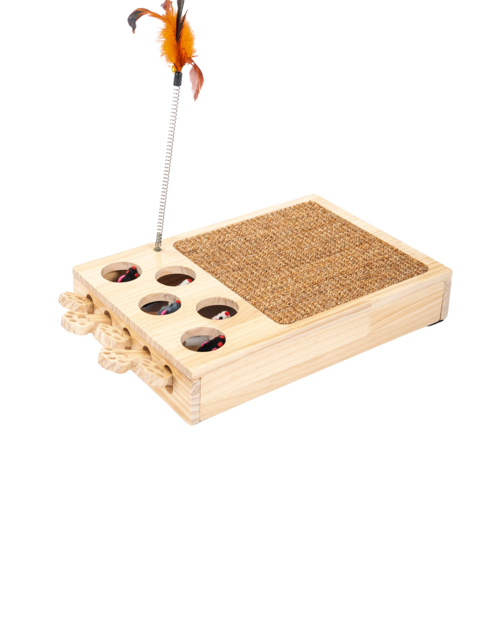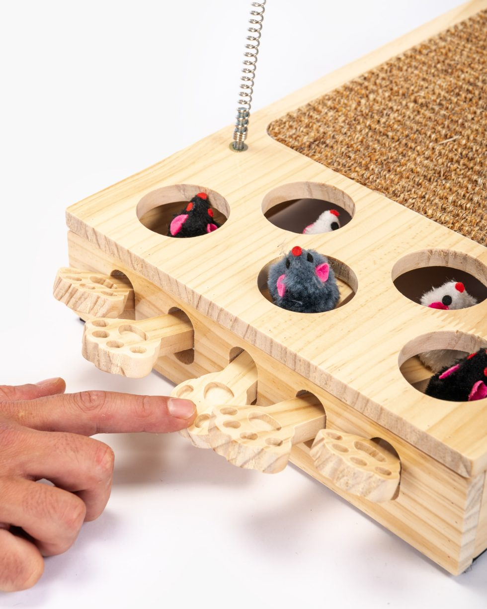 Este juguete interactivo para gatos hecho en madera tiene 5 pezuñas que tu gato puede apretar para hacer que el ratón salga, manteniéndolo entretenido. Además, incluye un rascador de sisal y una pluma para estimular su instinto de caza y diversión. El diseño antideslizante garantiza estabilidad mientras juega.