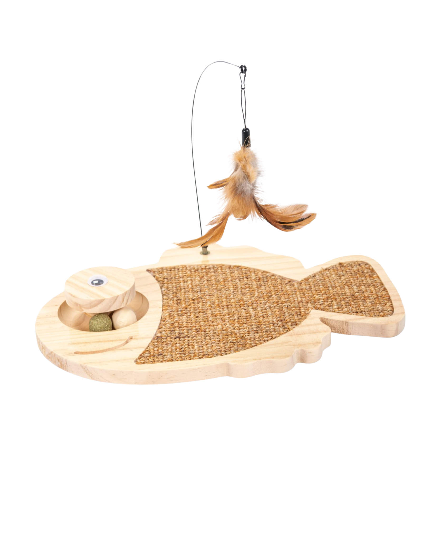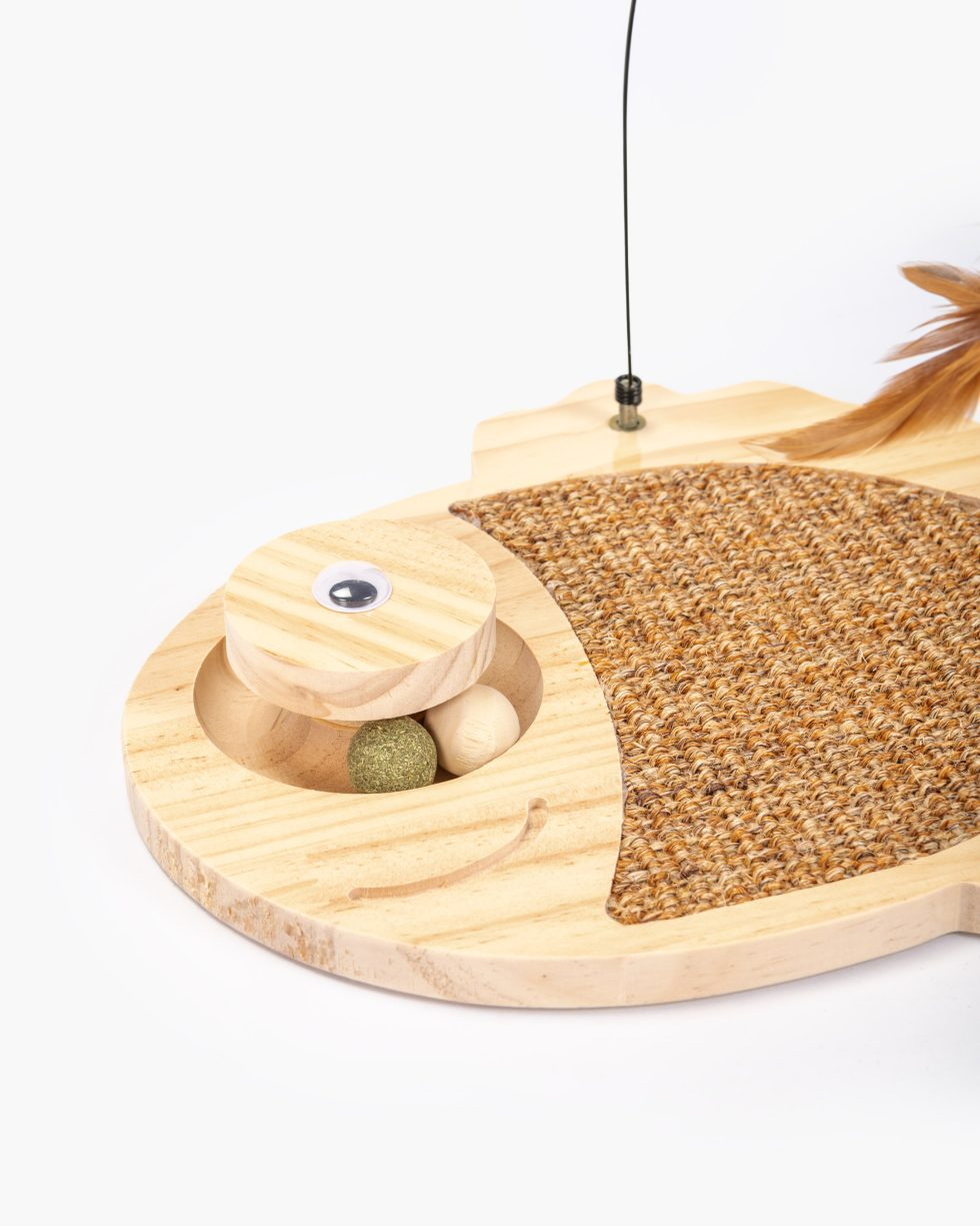Este juguete interactivo 3 en 1 para gatos incluye un agarre semicerrado con pelotas de madera y yerba gatera, un rascador de sisal para afilar las garras y juguetes de plumas oscilantes para mantener a tu gato activo y feliz. Con una forma divertida de pez, es ideal para jugar y decorar cualquier espacio. Además, cuenta con antideslizantes para mayor estabilidad en suelos lisos. Fácil de instalar en minutos.