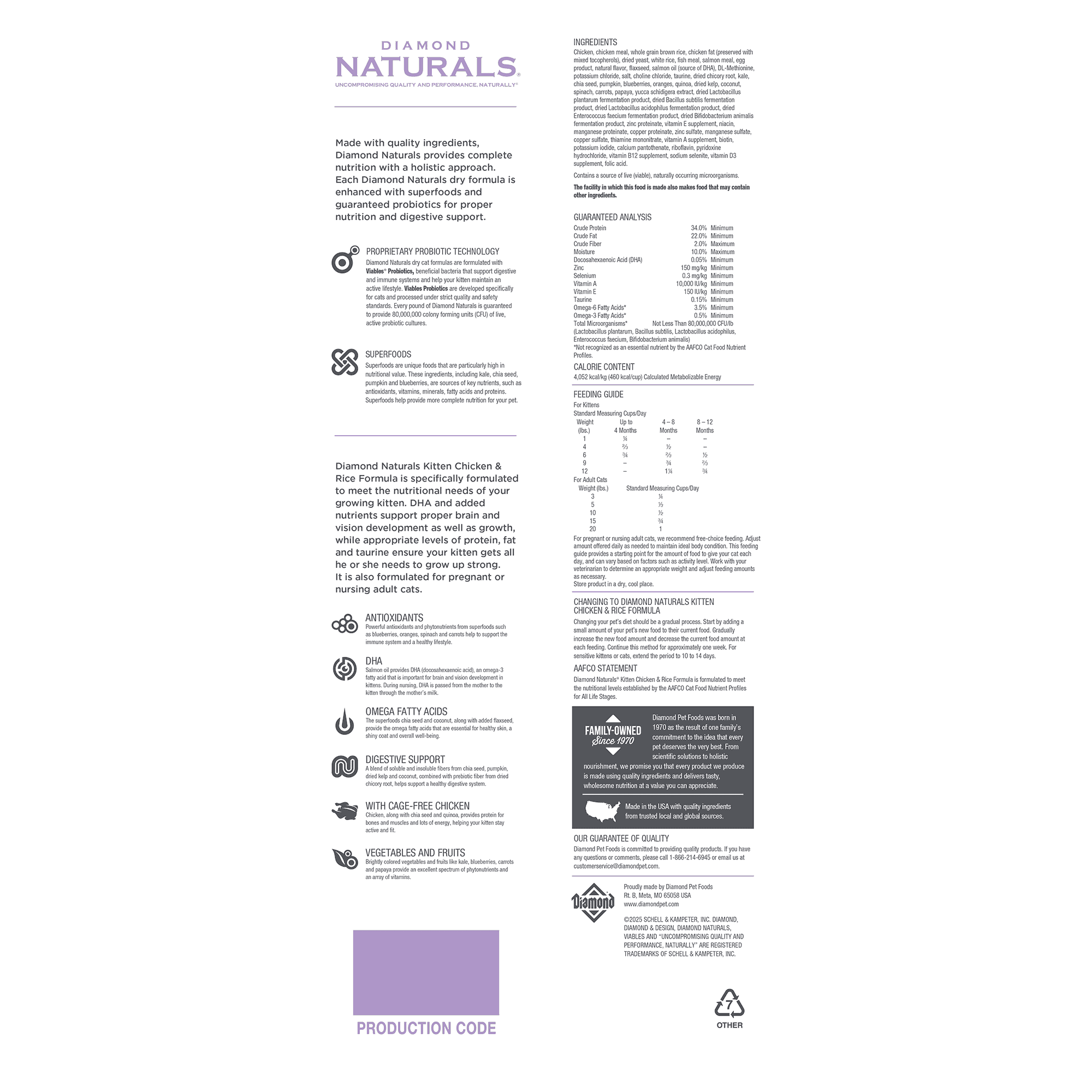 La fórmula Diamond Naturals Kitten Chicken & Rice está formulada para cumplir con los niveles nutricionales establecidos por los perfiles de nutrientes de alimentos para gatos de la AAFCO para todas las etapas de la vida.