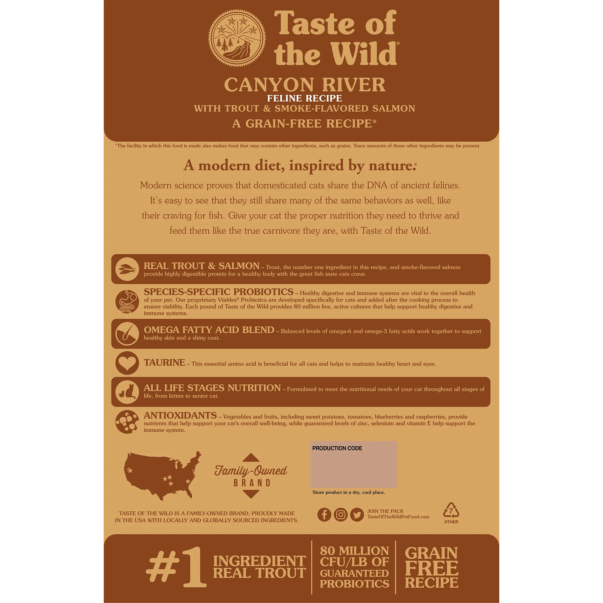 El agua que se emplea en el proceso de fabricación del pienso para gatos Taste of the Wild Canyon River Feline es limpia y sana, libre de microorganismos o productos químicos orgánicos e inorgánicos gracias a un proceso de ósmosis inversa. Los productos de la marca Taste of the Wild están formulados para satisfacer los niveles nutricionales establecidos por la Asociación americana oficial del control de calidad de alimentos (AAFCO). Se le ha calificado como pienso de 6 estrellas (máxima categoría), según www.dogfoodanalysis.com, web que clasifica los pienso de perros según sus calidad.