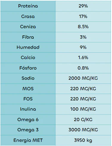 Carnes seleccionadas (carne de pollo, carne mecánicamente separada e hígado de pollo) harina de vísceras de pollo, harina y fécula de mandioca, guisante molido deshidratado, almidón de papa, aceite de pollo, aceite de salmón, hidrolizado de hígado de pollo y vísceras de cerdo, fibra de caña de azúcar, frutas y vegetales deshidratadas (mango, manzana, zanahoria y tomate), pulpa deshidratada de beterraga, linaza, cloruro de sodio, harina de algas Schizochytrium sp., zeolita, pared celular de levadura, fructooligosacáridos, inulina, extracto de yuca, colágeno hidrolizado, sulfato de condroitina, sulfato de glucosamina, vitaminas, minerales, ácido propiónico, lisina, metionina, taurina, extractos de té verde y romero, concentrado de tocoferol (antioxidante natural).
