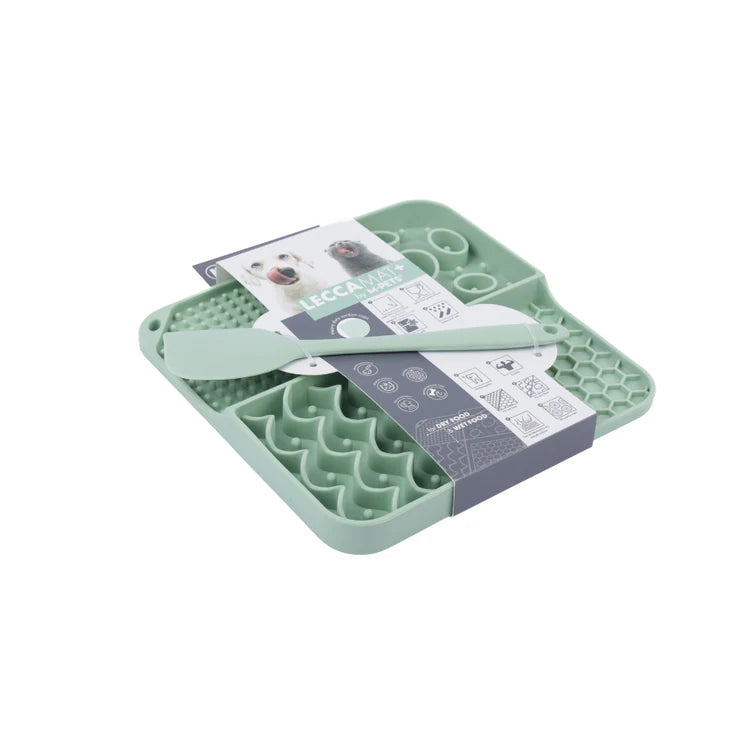 los tapetes para lamer multitexturizados LECCA+ de M-PETS®. Cada tapete tiene cuatro texturas 3D divertidas que fomentan una alimentación más lenta y reducen la ansiedad. Simplemente agrega la comida húmeda o seca de tu mascota al tapete y ¡que comience la diversión! Nuestros tapetes LECCA+ incluyen una cuchara para esparcir fácilmente y 80 ventosas para un