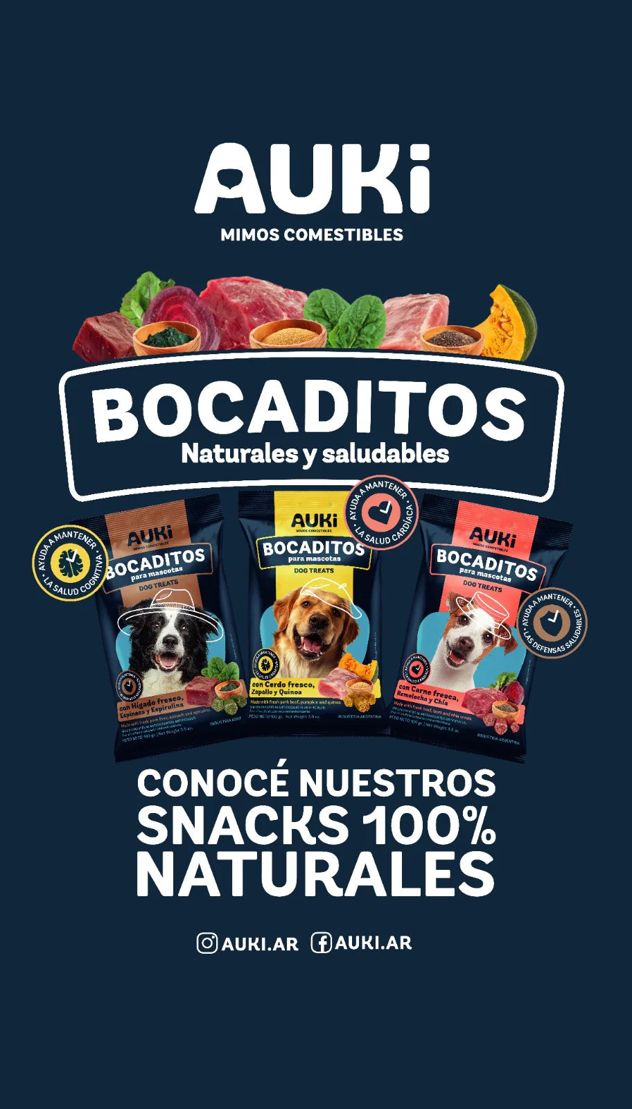 Bocaditos Auki son snacks saludables y deliciosos para tu perro, elaborados con ingredientes frescos y de calidad superior. Sin colorantes ni antioxidantes artificiales, estos bocaditos son ideales para premiar, entrenar y fortalecer el vínculo con tu mascota.
