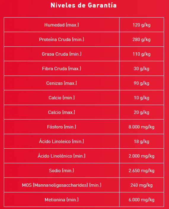Harina de Subproducto (Menudencias) de Aves, Harina de Subproductos de Res, Grasa de Aves, Saborizante (Hidrolizado de Hígado de Aves y Cerdo), Maíz en Grano1 3, Salvado de Soya1 2, Arroz Quebrantado, Levadura de Cerveza Deshidratada Inactivada, Levadura de Caña de Azúcar Deshidratada Inactivada, Salvado de Glúten de Maíz 601 3, Linaza en Grano (0,8%), Extracto de Yucca (0,05%), Salvado de Trigo, Mananoligosacáridos, DL-Metionina, Cloruro de Sodio, Vitaminas: A, D3, K3, E, B1, B2, B3, B5, B6, H (B7), B9, B12, Cloruro de Colina; Minerales: Óxido de Manganeso, Sulfato de Cobre, Sulfato de Hierro, Yodato de Calcio, Selenito de Sódio, Oxido de Zinc, Yeast Cell Wall, Aditivo Antifúngico (Ácido Propiónico), Antioxidante (BHA y BHT).